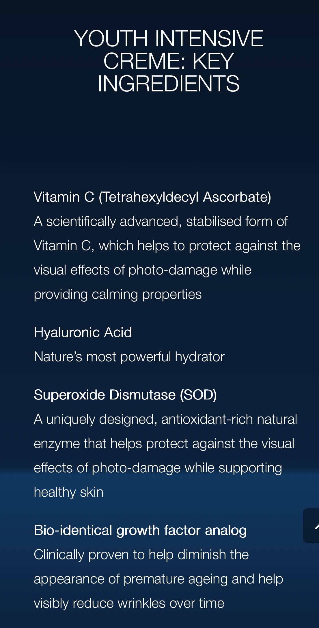 Youth Intensive Crème is an extraordinarily rich and luxurious age-defying formula that helps to reduce the appearance of fine lines and wrinkles as it provides powerful hydration. This transformative crème scientifically combines the purest and most effective botanically-derived moisturisers, antioxidants, resurfacing acids, and growth factor. Clinically proven,Youth Intensive Crème smoothes the skin, revealing a firmer and more radiant, youthful complexion.